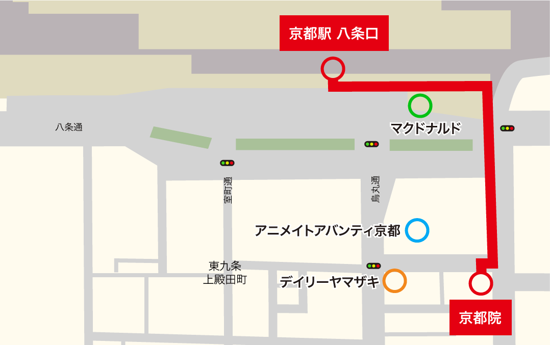 「京都駅八条口」徒歩2分。阪神高速8号京都線「上鳥羽IC」車で10分。