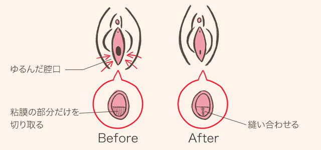 ゆるみの原因はさまざまです。そのなかで最も多い原因は出産です。出産によって膣口が緩むことが多々あります。その結果、ゆるみ以外にもセックス中に膣に空気が出入りする音がなるといった悩みや、入浴するとお湯が入る悩みも同時に抱えておらる方も多くおられます。また、出産時に切開した膣の縫合の仕方が雑で膣の形がゆがんでしまうこともあります。こちらも同様に整形を行うことで改善されます。
